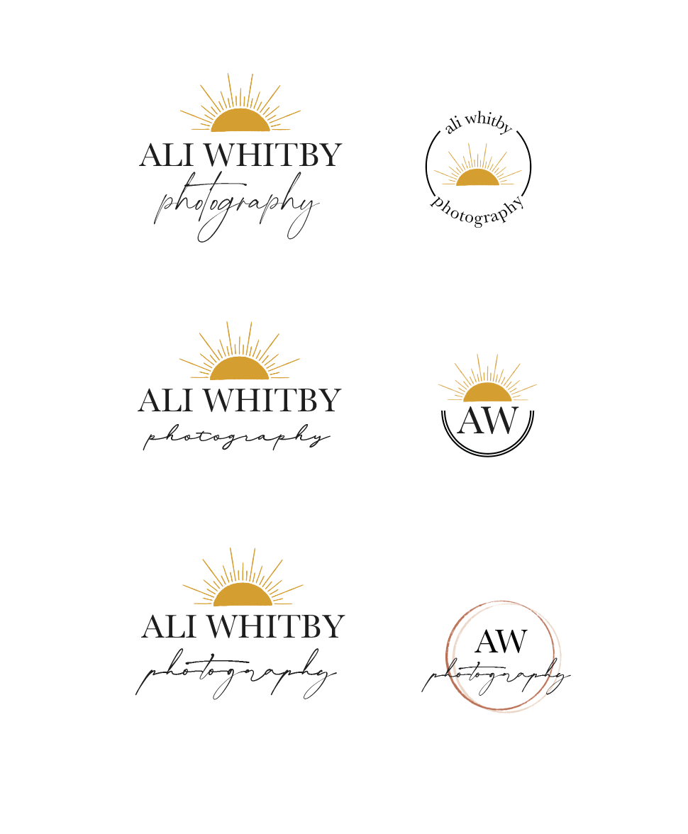 Ali approched me wanting her new logo to have a modern font and then have the word "photography" rounded over her name. I began reseaching different ways of incorporating A and W together for her secondary logo as well as new ways of laying her logo out. After my initial sketches, we landed on using here original sun logo with the next text layout.