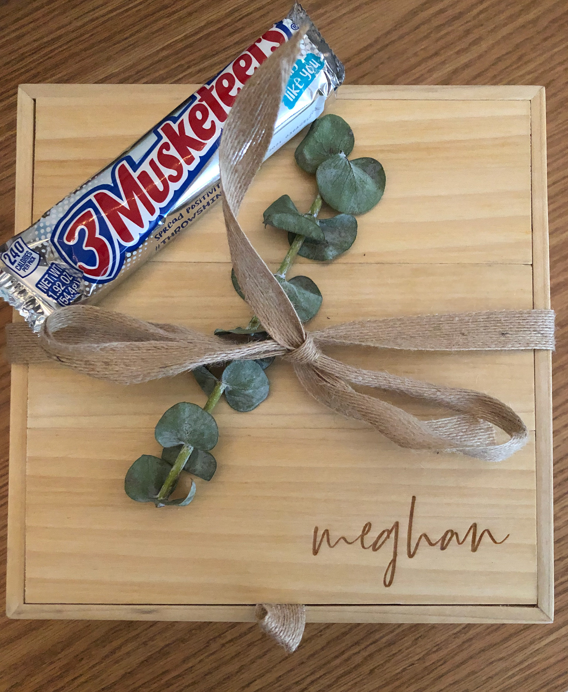 Below are the actual boxes I created for my bridesmaids. I had help from my dad to make the boxes, and then I stained them. For the names, I laser cut them so they would last longer than vinyl and give the boxes a more professional and clean design.