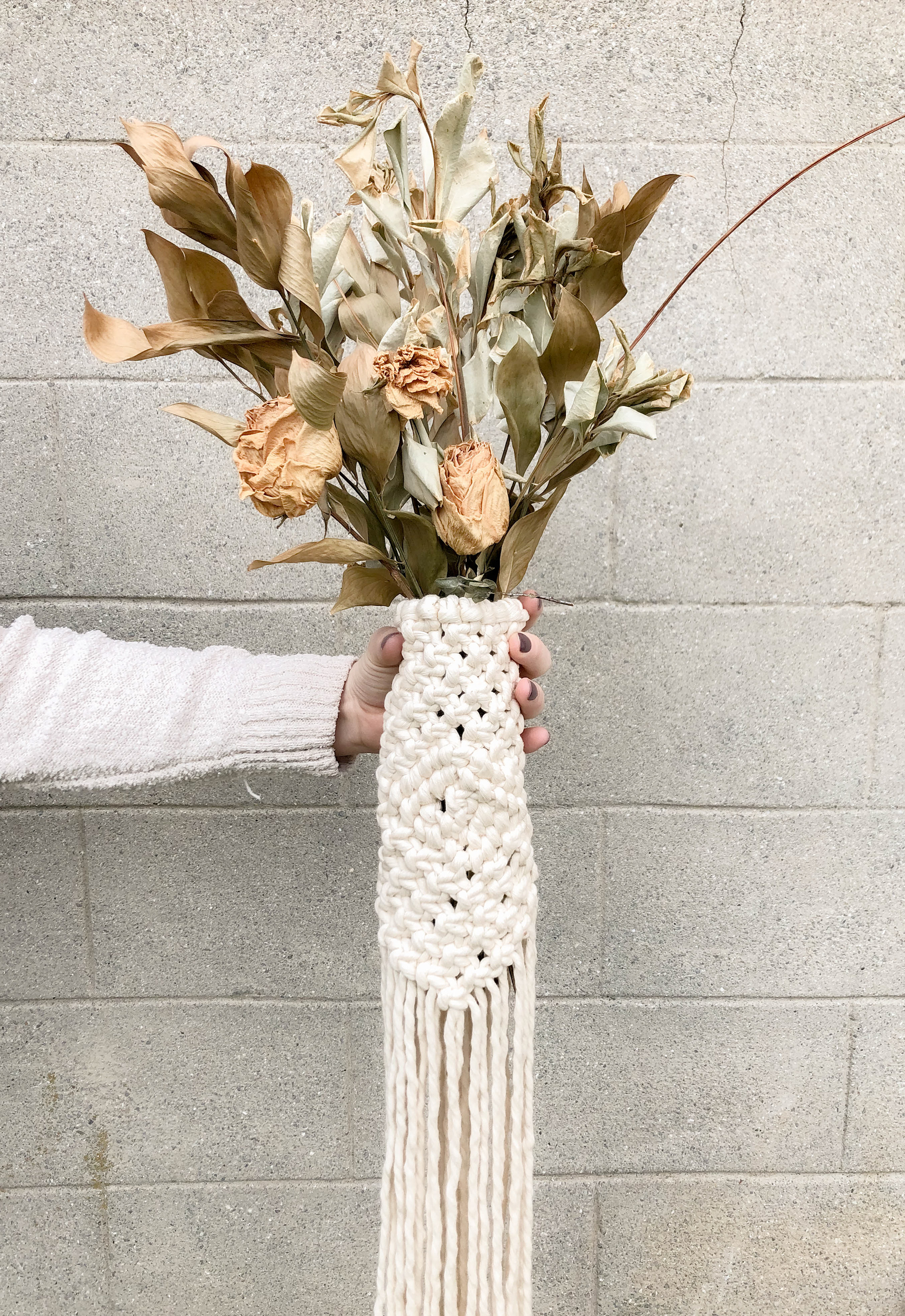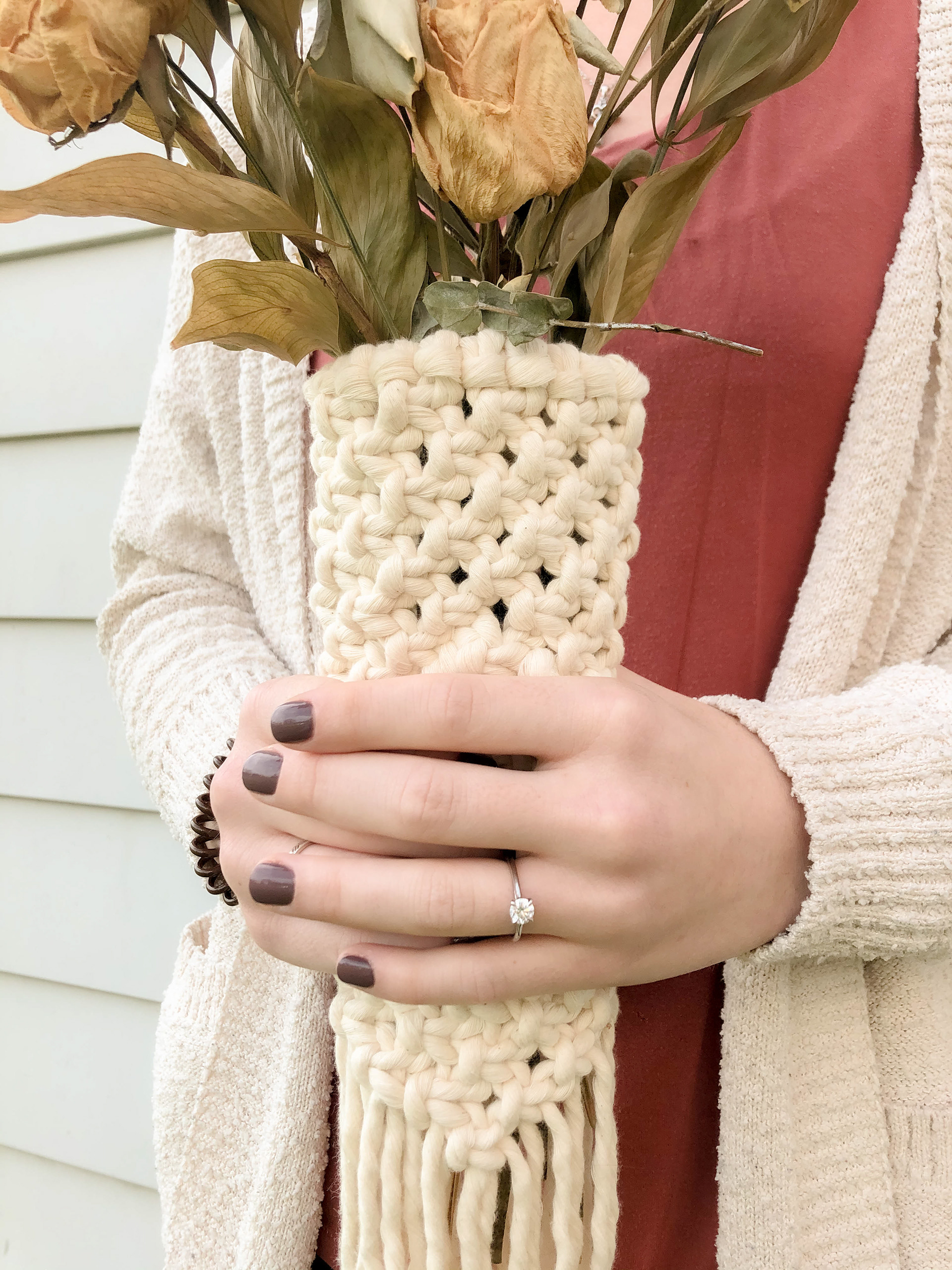 When experimenting with macrame, I fell in love with so many ideas. Below is my take on flower bouquet holders. This is something I have not ever seen before and I felt that it fit right into my boho inspired wedding theme (featuring my beautiful ring!).