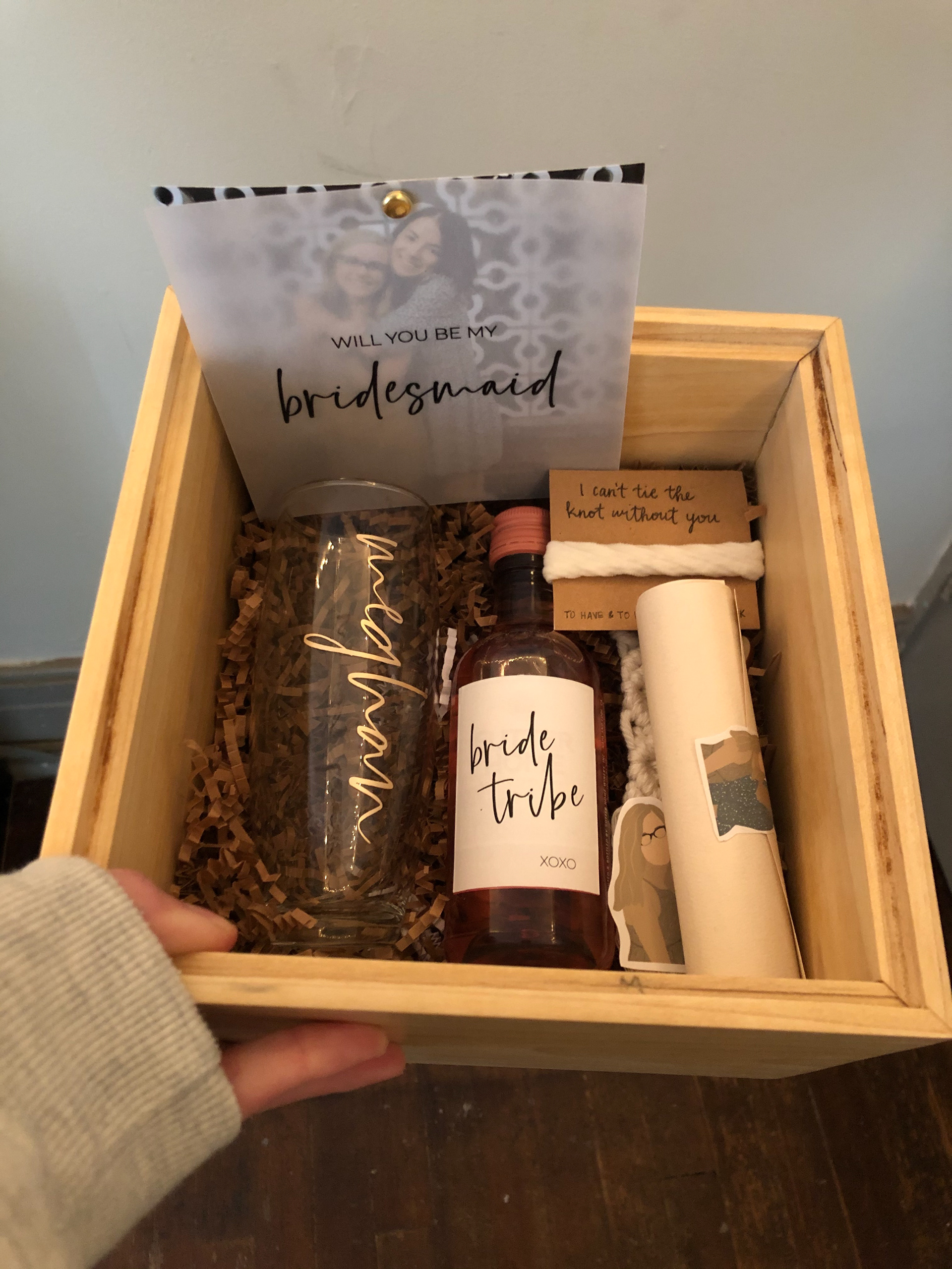 I created everything included in the box: Champagne flute with personalized name, wine bottle label, macrame keychain, digital illustration sticker, and picture with the message "Will you...?"